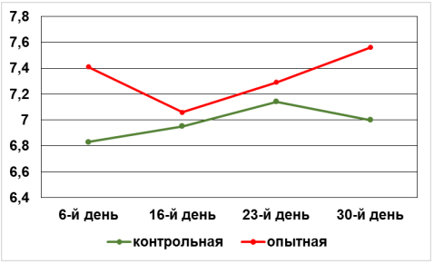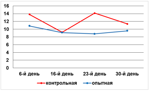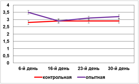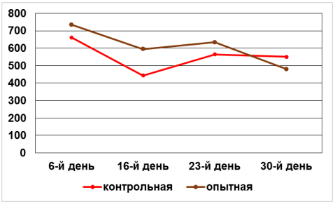 На 6-й день после хирургического вмешательства количество лейкоцитов в опытной группе было ниже на 28 %, на 16-й день – на 1 %, на 23-й день – на 61 %, на 30-й – на 19 % по сравнению с контрольной группой. При сравнении средних значений количества эритроцитов в течение эксперимента можно отметить повышение их количества в опытной группе на 6-й, 23-й и 30-й день опыта по сравнению с соответствующими показателями контрольной группы (рис. 6).