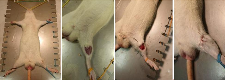 После наркотизации крыс на задней правой конечности в области большеберцовой кости был проведен оперативный доступ длиной 1 см. Мышцы были раздвинуты без травмирования для более широкого доступа кости. В области проксимального эпифиза большеберцовой кости был произведен надрез кости без смещения и обломков. Затем операционная рана была ушита узелковым швом, не рассасывающимся материалом (рис. 1).