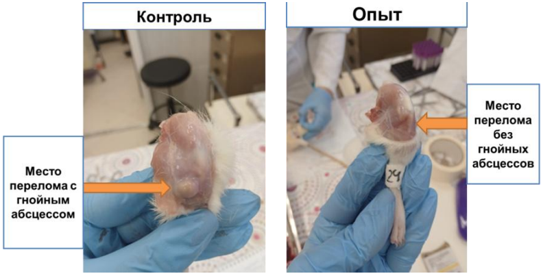 Таким образом, все фазы воспаления проходят более гармонично и сбалансированно, что непосредственно ускоряет регенерацию. Асептический характер воспаления в послеоперационной ране положительно влияет на костную регенерацию. С одной стороны, это позволяет избежать попадания инфекции в область перелома, а с другой – происходит снижение воспалительных реакций за счёт уменьшения бактериальной нагрузки. В нашем исследовании это подтверждается гематологическими результатами анализов крови, в которых уровень лейкоцитов у опытной группы остаётся в пределах нормы или незначительно повышается. В то же время в контрольной группе наблюдается умеренный лейкоцитоз. Снижение веса опытных животных в сочетании с эритроцитозом демонстрирует напряжённость и энергозатратность процессов костной регенерации в опытной группе.
