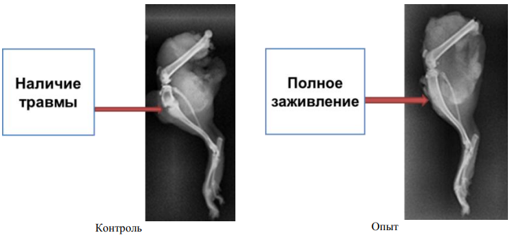 Результаты и их обсуждение. Морфо-биохимический анализ крови показал, что в опытной группе происходит снижение общего количества лейкоцитов, повышение эритроцитов и тромбоцитов на всех этапах исследования. А также достоверное повышение ионизированного кальция в крови на последней неделе проведения эксперимента. По результатам рентгенологических исследований у животных из экспериментальной группы перелом полностью зажил на неделю раньше, чем у животных из контрольной группы. В то время как у контрольных особей процесс заживления занял 30 дней, у животных из опытной группы он завершился уже через 23 дня.