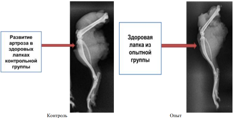 Было отмечено, что у большинства животных из контрольной группы было развитие незначительных структурных изменений в области коленного сустава (артроз), в связи с нагрузкой при повреждении второй лапки. При этом таковых изменений у животных с опытной группы не было обнаружено (рис. 6).