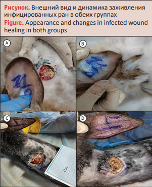 После проведения моделирования гнойных ран кожного покрова площадью от 4 до 5% по отношению к поверхности тела животного (площадью от 120 до 300 мм2 ) на 5-е сут. от момента инфицирования кроликов разделили на 2 группы по 7 особей в каждой. Способ моделирования гнойной раны заключается в моделировании после подготовки операционного поля, разреза мягких тканей диаметром 3,5–5,5 см по трафарету, выполненному из листа рентгеновской пленки. На область планируемого разреза маркером наносились контуры стандартной обширной раны округлой формы в межлопаточной области. По намеченному контуру под местным обезболиванием (инфильтративная анестезия 0,5%-ным новокаином) рассекалась кожа и поверхностная фасция. Затем лоскут шкурки выворачивался шерстью во внутрь раны, фиксировался повязкой, через 3–5 сут. в ране формировался гнойный процесс.