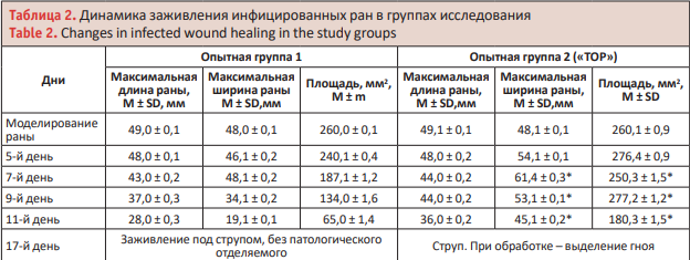 На 7-й день лечения у 57,1% кроликов обеих групп отмечена гипертермия. К 9-му дню у животных в опытной группе повышенной температуры не наблюдалось, тогда как у 14,3% кроликов в контрольной группе все еще была незначительная гипертермия. В более поздние сроки наблюдений у животных в обеих группах повышения температуры не наблюдалось (табл. 1). К 5-му дню после моделирования гнойных ран их размеры у 2 животных в обеих группах превышали первоначальную площадь на 5–10 мм2 .