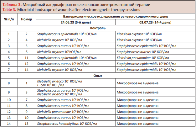 На 14-й день эксперимента в опытной группе после проведения электромагнитной терапии по предложенной схеме лечения гнойных ран у животных микрофлора не выявлена. Микробный пейзаж контрольной группы во вторую фазу течения раневого процесса на 90% изменился и уменьшилось количество бактерий. У 37,5% кроликов в контрольной группе выявлены грамположительные бактерии Staphylococcus epidermidis и грамотрицательные бактерии Klebsiella oxytoca, в 14,29% случаев – грамположительные бактерии Staphylococcus aureus и у одного кролика (14,29%) была обнаружена грамотрицательная факультативноанаэробная капсульная бактерия Klebsiella pneumoniae.