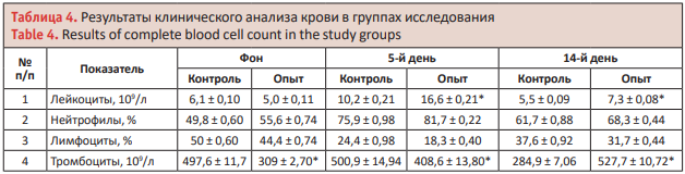 На 14-й день эксперимента показатели содержания лейкоцитов в крови в обеих группах были в пределах физиологической нормы, причем в контрольной группе их содержание было ниже первоначальных величин. Содержание тромбоцитов в крови кроликов на 5-й день после моделирования гнойной раны в контрольной группе возросло на 0,7%, в опытной группе – на 32,2%.