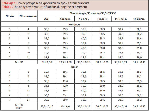Перед моделированием гнойных ран проведен общий клинический осмотр животных и измерена температура тела. Все показатели были в пределах физиологической нормы. Непосредственная длительность данного эксперимента составила 17 дней. В обозначенный период проведена оценка интенсивности регенерации и качества заживления гнойных ран с изучением микробного пейзажа и клинический анализ крови (количество лейкоцитов, нейтрофилов, лимфоцитов, тромбоцитов). Клинический контроль производили путем регистрации температуры тела, а также местных признаков воспаления – наличия локального отека, наличия гнойного отделяемого, сроков появления грануляционной ткани.